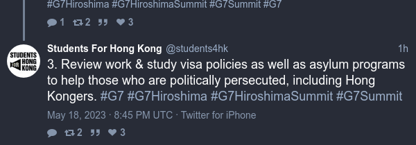 R to @students4hk: 3. Review work & study visa policies as well as asylum programs to help those who are politically persecuted, including Hong Kongers. #G7 #G7Hiroshima #G7HiroshimaSummit #G7Summit https://nitter.hongkongers.net/students4hk/status/1659299286071508994#m