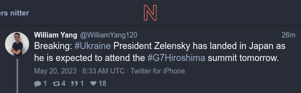 Breaking: #Ukraine President Zelensky has landed in Japan as he is expected to attend the #G7Hiroshima summit tomorrow. https://nitter.hongkongers.net/WilliamYang120/status/1659809592707264513#m