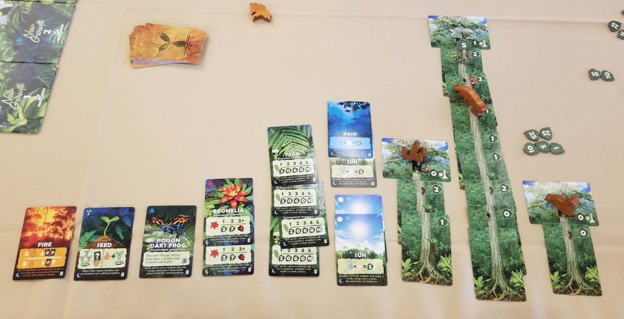 Canopy was my new game for the day. Each turn, you look at three piles of cards in sequence. If you pass on a pile, you sweeten it for the next person by adding a card. The cards are trees, plants, animals, weather, etc. that mix and match to score points.