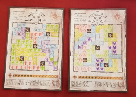 Spatial visualization is not easy for me, especially with 9:00 pm brain, so I was surprised by how close the final scores were (79 vs. 74). My expert forestry and attention to diagonals served me well. Drawing monsters on my opponentās map was definitely the best part. Muhuhaha