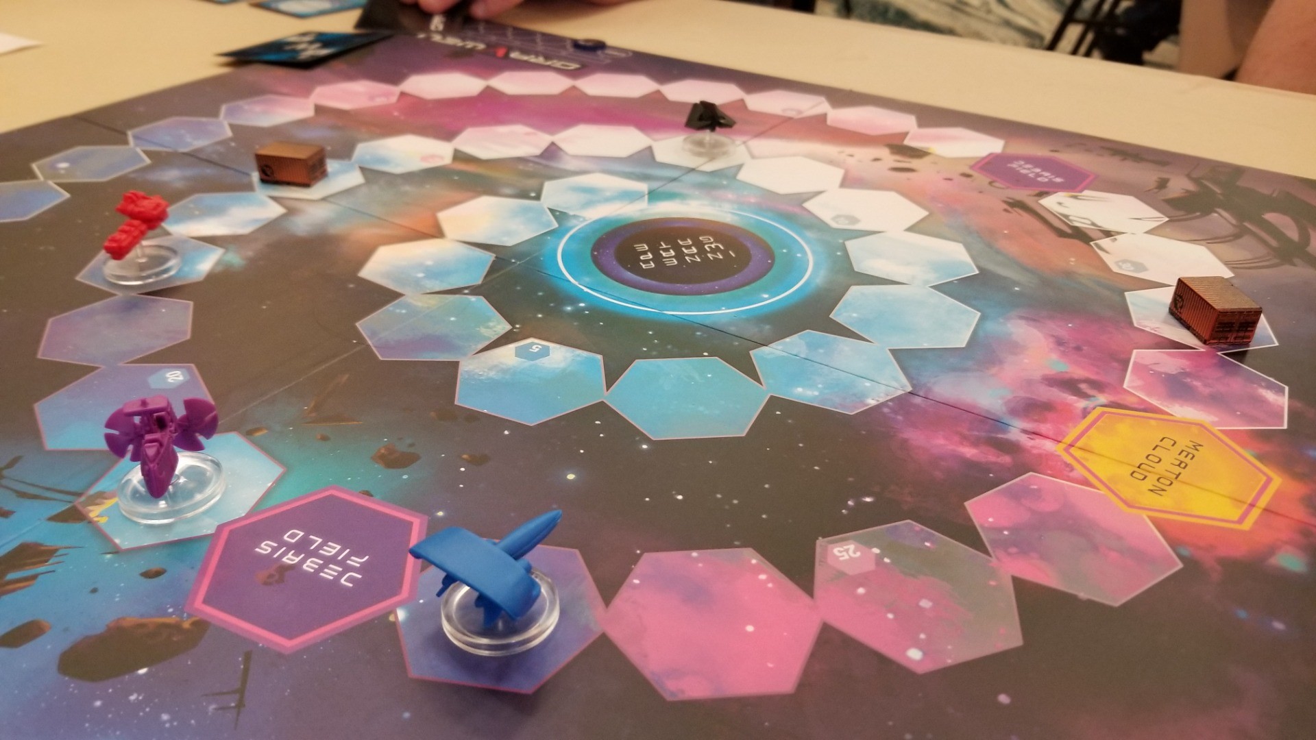 Each round, you draft a hand of movement cards that pull you toward, or repel you from, the nearest object. You choose which cards to play simultaneously, in secret, and sort of rubber band your way around the spiral, hoping that your ship will fly in the direction you intended.