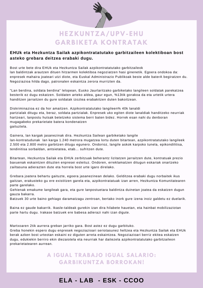 EHUk eta Hezkuntza Sailak azpikontratatutako garbitzaileen kolektiboan bost asteko grebara deitzea erabaki dugu