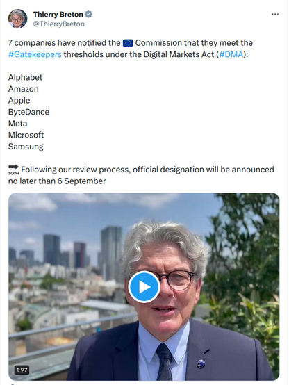 Thierry Breton: 7 companies have notified the 🇪🇺 Commission that they meet the #Gatekeepers thresholds under the Digital Markets Act (#DMA):
