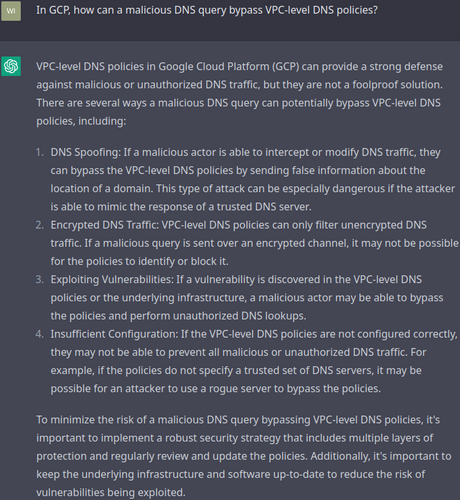 #ChatGPT could have been more useful. #DNS logs are handled by the Cloud DNS API but the best way to capture them is to create a DNS Server Policy from VPC settings.