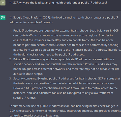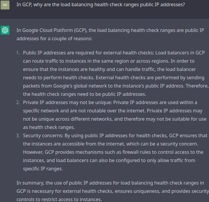 #ChatGPT clarifying one of the major differences between #GCP & #AWS when it comes to load balancers & health checks from a trusted IP space