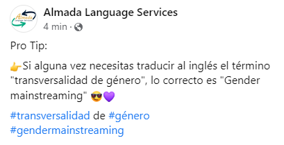 👉Si alguna vez necesitas traducir al inglés el término "transversalidad de género", lo correcto es "Gender mainstreaming" 😎💜