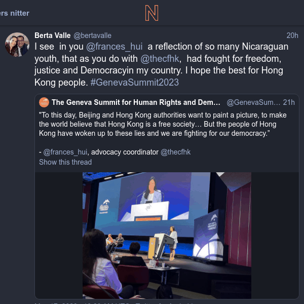 @bertavalle RT by @frances_hui: I see in you @frances_hui a reflection of so many Nicaraguan youth, that as you do with @thecfhk, had fought for freedom, justice and Democracyin my country. I hope the best for Hong Kong people. #GenevaSummit2023 https://nitter.hongkongers.net/bertavalle/status/1658776700795199489#m