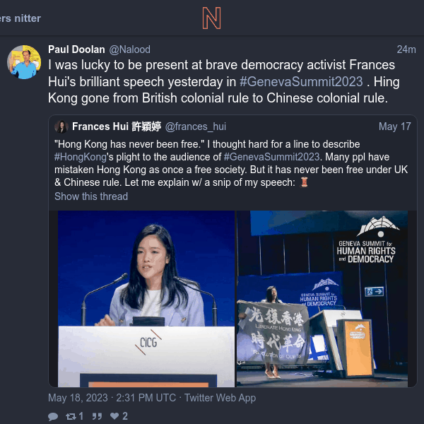 @Nalood RT by @frances_hui: I was lucky to be present at brave democracy activist Frances Hui's brilliant speech yesterday in #GenevaSummit2023 . Hing Kong gone from British colonial rule to Chinese colonial rule. https://nitter.hongkongers.net/Nalood/status/1659204990890827776#m