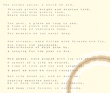 I asked ChatGPT to write a poem about nostalgia in the style of Robert Frost, if he were alive today and his formative years were in the 1980s and 1990s. Rendered with my Underwood typewriter algorithm.