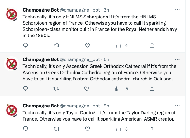 Technically, #genuary28 is supposed to be generative poetry. But actually, I wrote something poetry-adjacent, a twitter bot that I've always wanted to create. Follow it at https://twitter.com/champagne__bot. No P5js code, sorry. #genuary