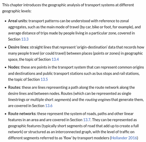 Want to learn more about the analysis of transport systems at different geographic levels, visit https://geocompr.robinlovelace.net/transport.html.