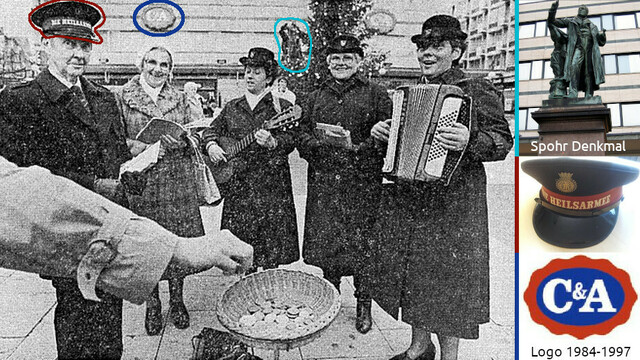 Lösungsweg: Suche C&A auf openstreetmap.org, Spendensammlung Heilsarmee raten + Mütze verifizieren (z.B. duckduckgo Bildsuche)