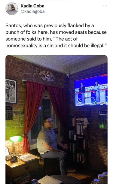 The only time I will feel badly for #GeorgeSantos, here with the #NewYork Young #Republican Club watching the #GOPDebate. I never want to blame the victim of #homophobia, but what does the guy expect when hanging out with these turds?