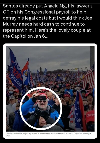 "Santos already put Angela Ng, his lawyer's GF, on his Congressional payroll to help defray his legal costs but I would think Joe Murray needs hard cash to continue to represent him. Here's the lovely couple at the Capitol on Jan 6..."
