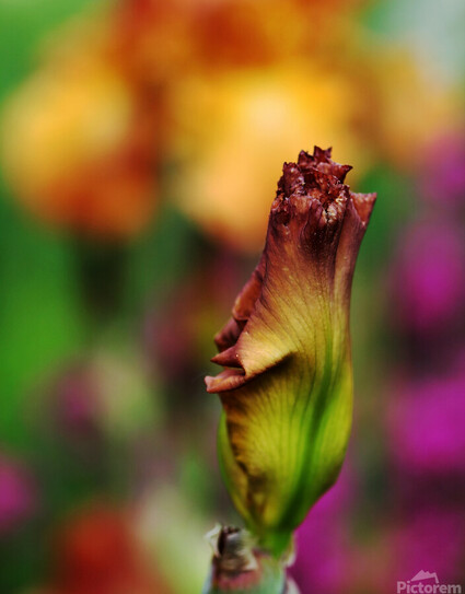 The bearded Butterscotch German Iris bud, Iradaceae, is almost as dramatic in the spring garden as the full bloom. Both the Iris blooms and buds are quite showy and have a graceful beauty. I have this as a metal print in my bathroom and it's stunning!