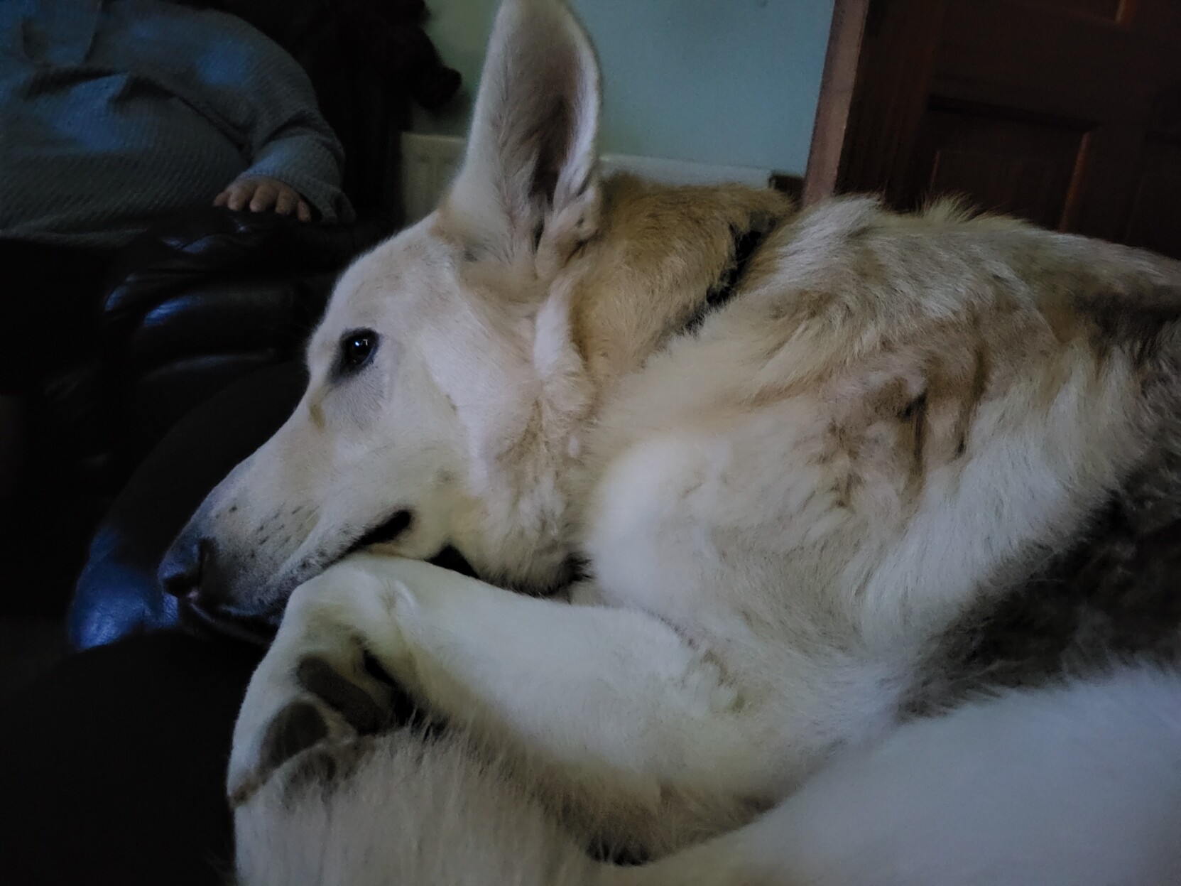 Chewie made me cuddle, I swear I wasn't late to my meeting 😆 #plzboop #dogsofmastodon #germanshepherd