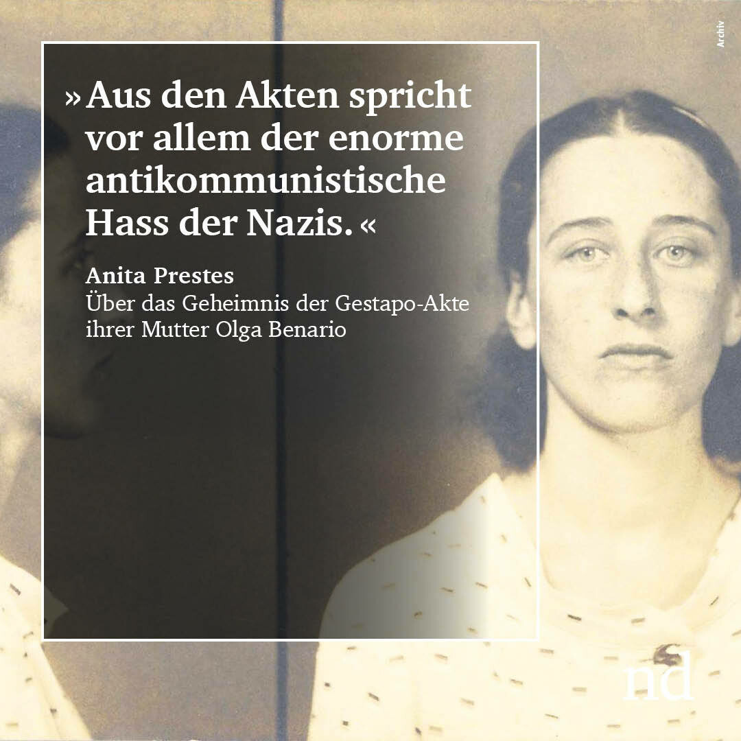 Die 86-jährige Kommunistin Anita Prestes lüftet das Geheimnis der Gestapo-Akte ihrer Mutter Olga Benario. „Offensichtlich widerstand sie allen Drohungen der #Gestapo und nahm auch ihren Tod in Kauf”, erzählt Anita Prestes im Gespräch mit nd. 👉 https://www.nd-aktuell.de/artikel/1173947.html