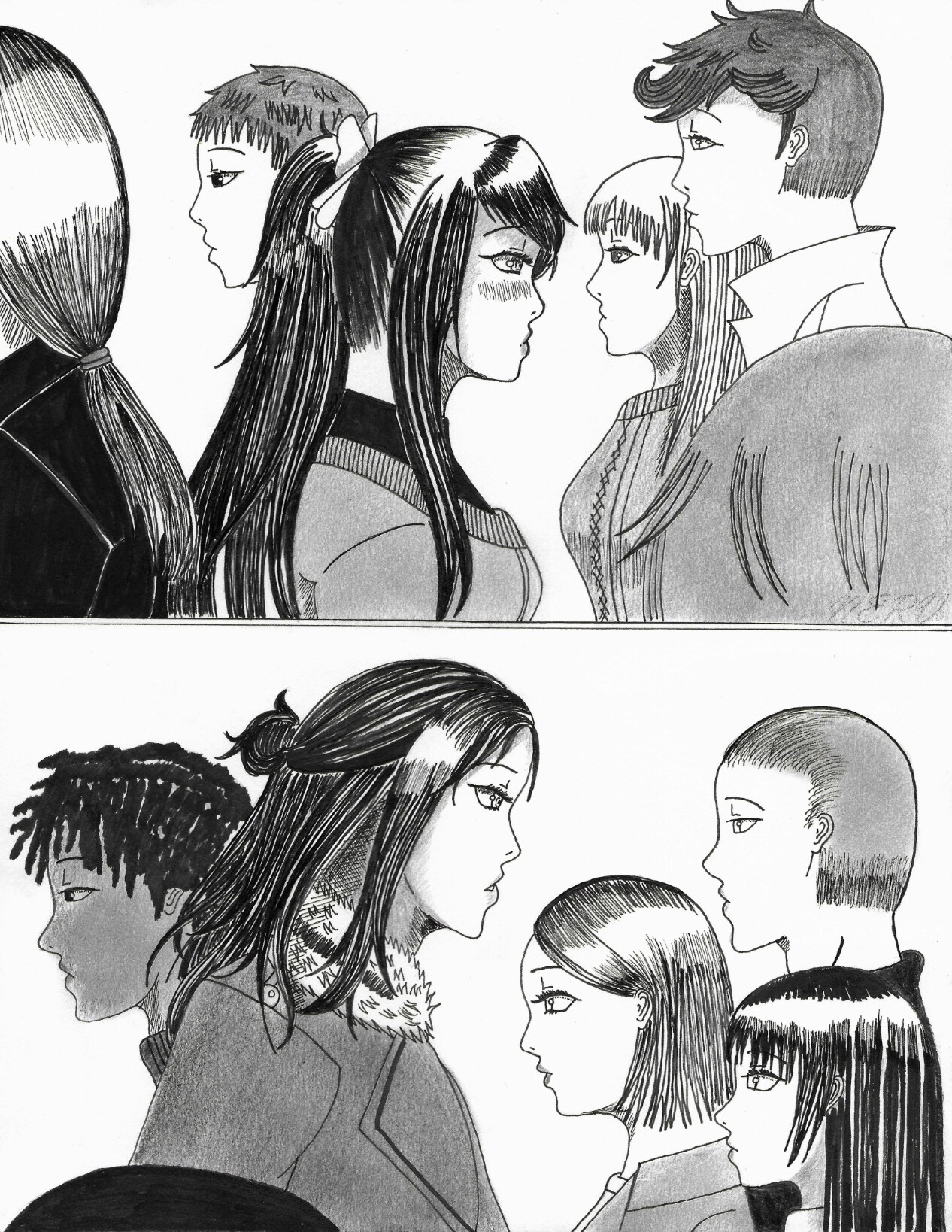 I kind of lost track of time. This is the last page (for now). This is the most recent one; I made it around early February in fact. It took me a very long time to finish it because I am not used to drawing crowds.