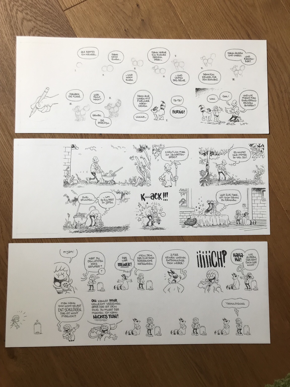Ich hätte die Originale der #Glückskind-Folgen 400, 402 und 402 im Angebot. 21x55cm gross, Fineliner (und Bleistift) auf Aquarellpapier. Jeweils für 450,00€ zzgl. Versand. Bei Interesse bitte DM. 😊🦝☕️☀️