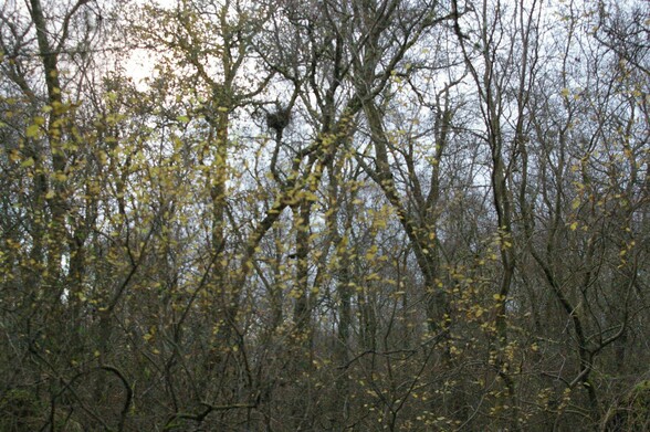 small yellow #goatwillow leaves against a mesh of twigs and branches, #twilight sky behind