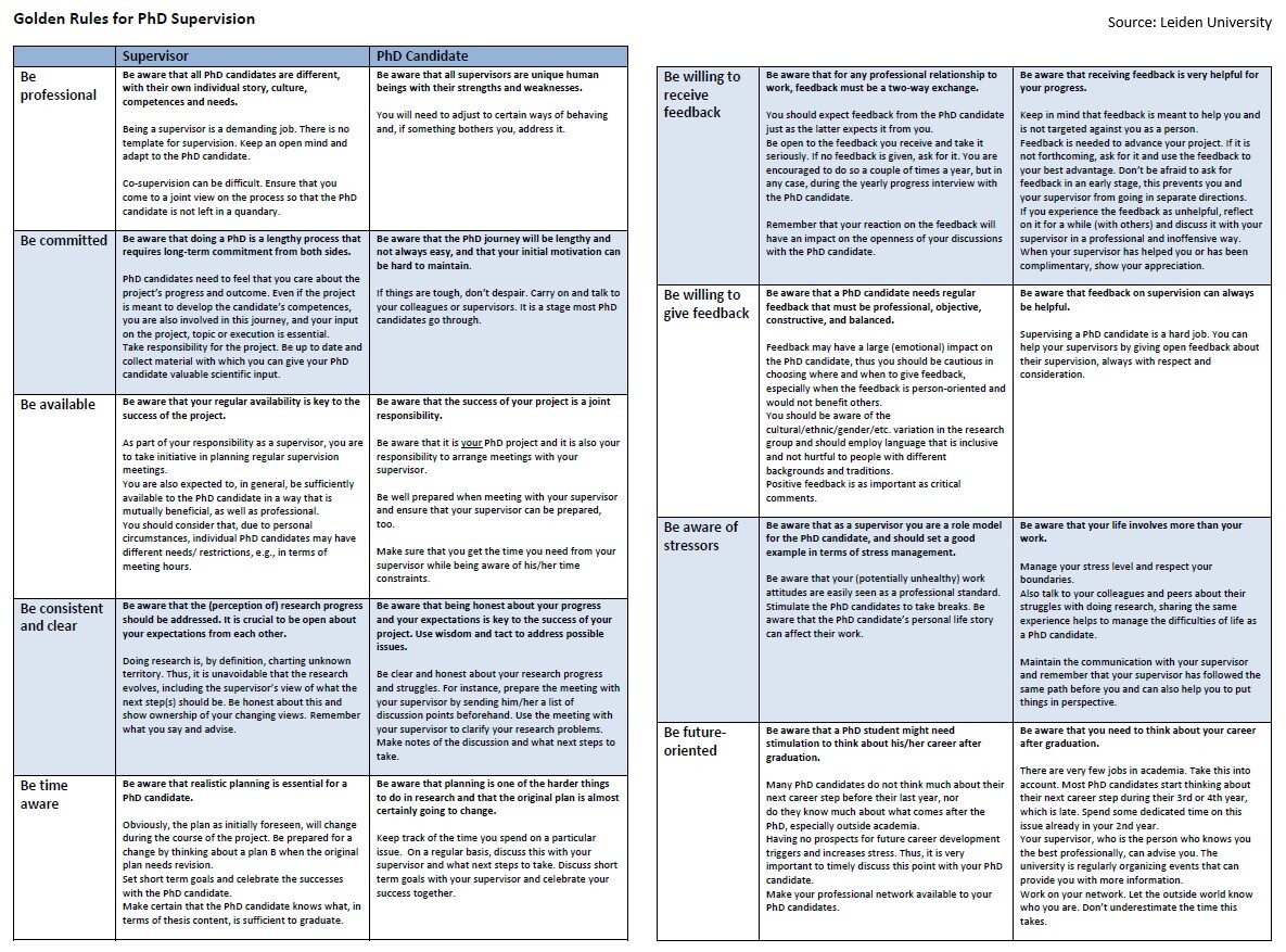 "How to practice excellent supervision? This concise and practical document with Golden Rules for PhD Supervision (addressing the positions of both supervisors and PhD candidates) was drafted by Universiteit Leiden"