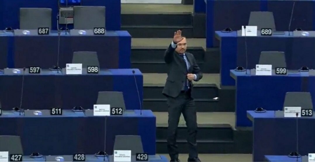 Un saluto agli indifferenti, ai sottovalutatori, ai minimizzatori, ai banalizzatori, a quelli che è solo folklore e goliardia e il neonazifascismo non è un problema. Il saluto fascista nel parlamento europeo è qui. Questo braccio infame si tende anche sul vostro sonno complice.