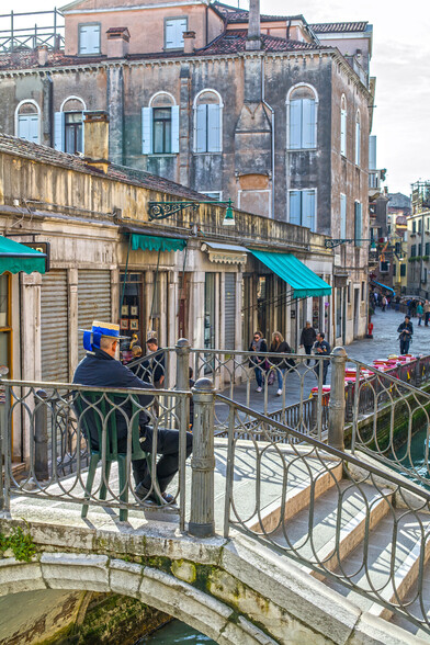 Gondolier waiting for tourists sitting on a bridge on a canal in Venice