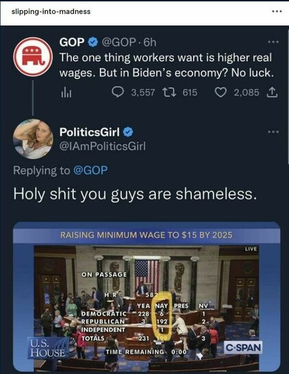 #GOPHipocrasy voted against raising the minimum wage on party lines, Courtesy of CSPAN