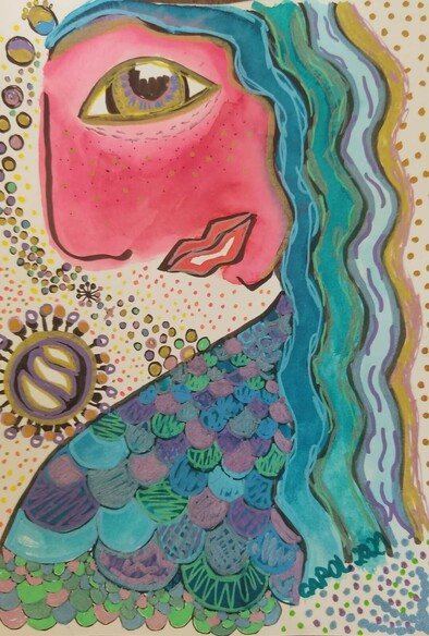 An interpretatio of a mermaid that I made in 2020. I even added a little virus that shall not be named. One of my favorite pieces.