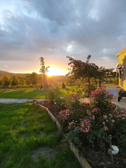 ID: a late autumn sunset from a garden in northern Tasmania. There is golden light everywhere and for an amateur camera photographer like Annetta this is an amazing image. No filter - but this picture encapsulates the joy of living here.