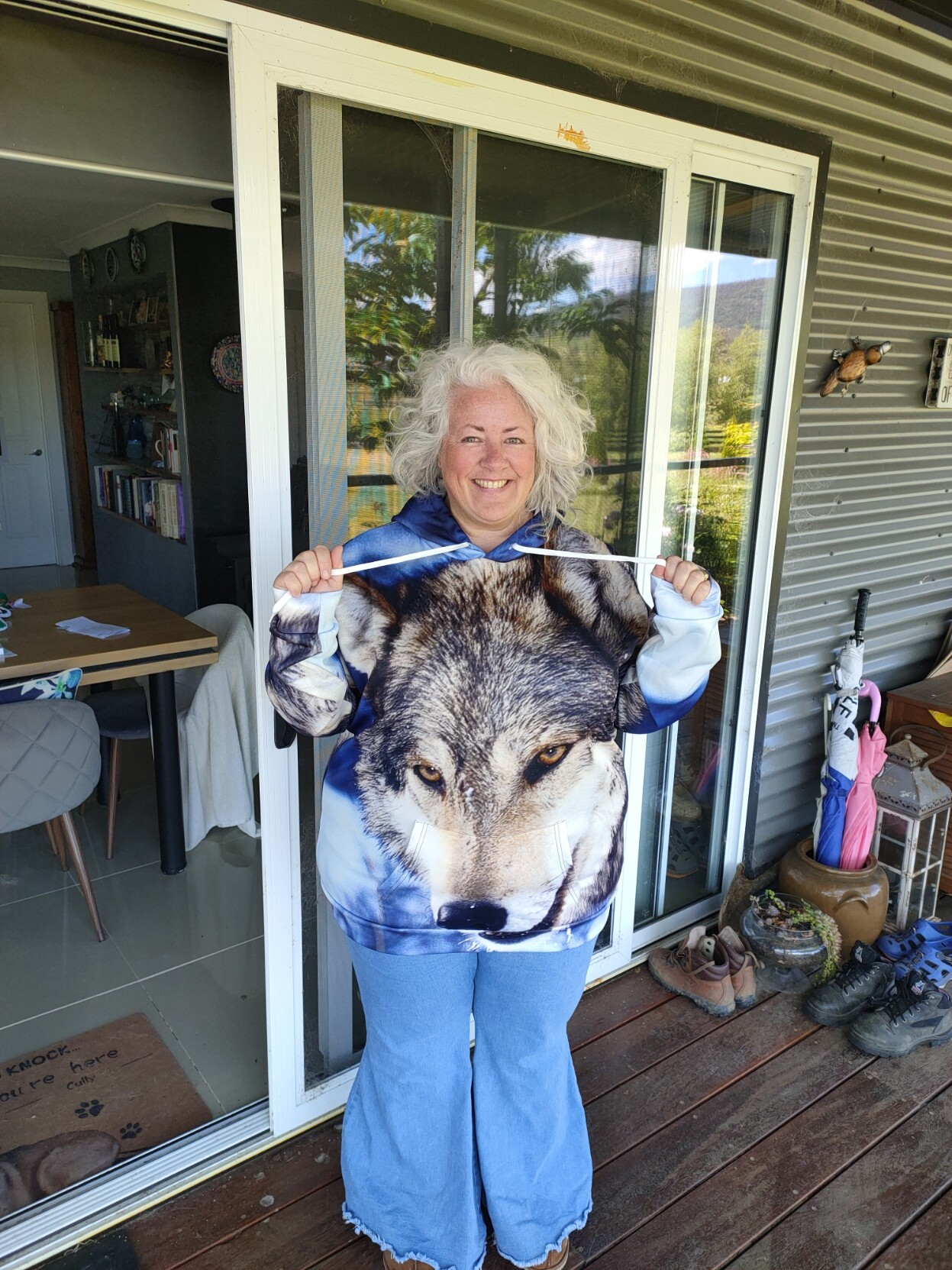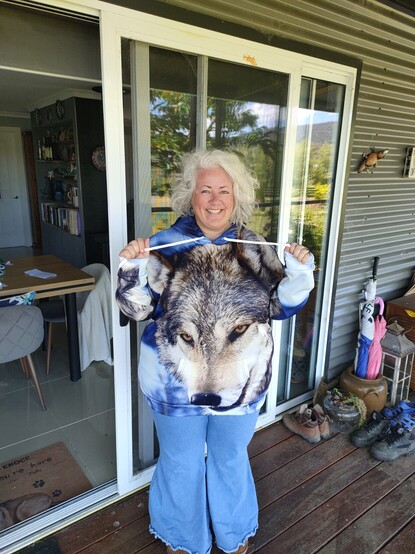 ID: a woman with white curly hair and a huge grin holds the white strings of a long hoodie featuring a picture of a wolf that looks remarkably like a stonkingly gorgeous Malamute X Shepherd dog they own. Her joy is palpable.