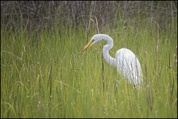 This is a great egret with its neck forming the classic "S" shape, ready to strike out a prey. Notice that towards the top of its neck there is a spot that is bent at a right angle as if there is a hinge in the neck. I've seen that before in another egret. I'll probably goggle about egret necks. I took this photo at the Sabine National Wildlife Refuge in Louisiana.