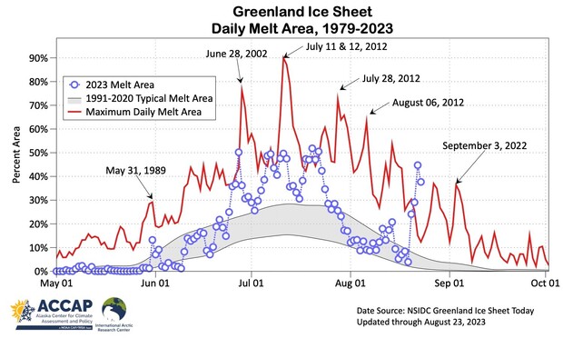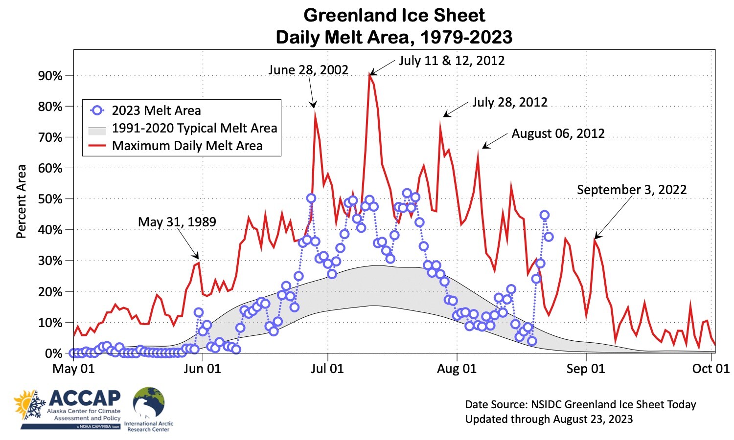 Whoa! #Greenland Ice Sheet melt on Tuesday (August 22) at about 45% of the total ice sheet area is the highest this late in the summer in NSIDC data. The previous latest date with this high of melt area was August 15, 2021. #Arctic #Summer2023 H/T @ZLabe @Ruth_Mottram