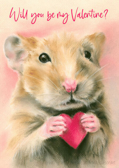 One of my most popular Valentine card designs features an adorable little hamster created in soft pastels. The cute creature is holding a red heart in its little pink hands and has an imploring look on its face. I designed several different Valentine's Day cards with this artwork. This particular one may be found in my collection at https://www.greetingcarduniverse.com/holiday-cards/valentines-day-cards/be-my-valentine/will-you-be-my-valentine-1669156?aid=412298