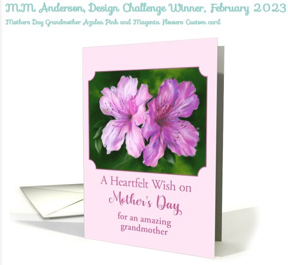 I am very happy to have an interview published in the blog of Greeting Card Universe as a bonus for winning the February Design Challenge with my azalea Mother's Day card. See it at https://www.greetingcarduniverse.com/blog/2023/04/m-m-anderson-design-challenge-winner-february-2023/