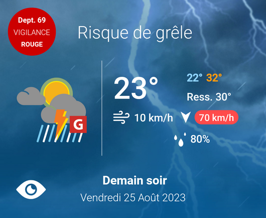 En Rhône-Alpes, la forte #chaleur 🌡 persiste alors que les #pluies 🌧 arrivent en Bretagne. Attention aux #orages ⛈ du Massif-Central au Grand Est avec un risque de #grêle 🚨. Le temps est dégradé avec le #vent 🌬 en Occitanie.
