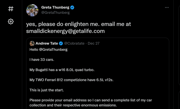 That is ALL it took. Because Andrew Tate is a semisentient bag of effluent and Greta Thurnberg is a smart fucking ACTUAL person with a soul and the basic capacity to use words.