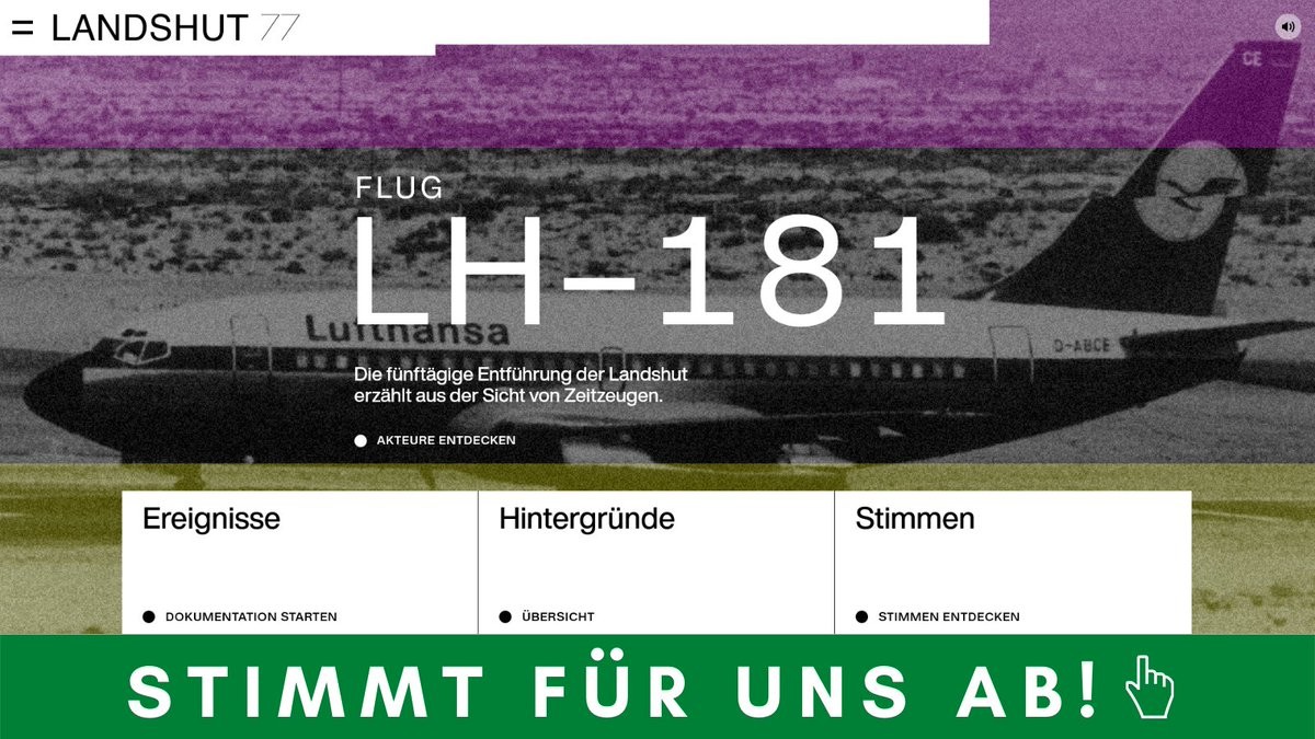 Wir sind mit dem Webprojekt Landshut77 für den #GrimmeOnlineAward nominiert! 🤩 Die 5-tägige Entführung des Passagierflugzeugs wird auf http://www.landshut77.de aus der Sicht von Zeitzeugen erzählt. Jetzt brauchen wir Eure Stimmen! #GOA22