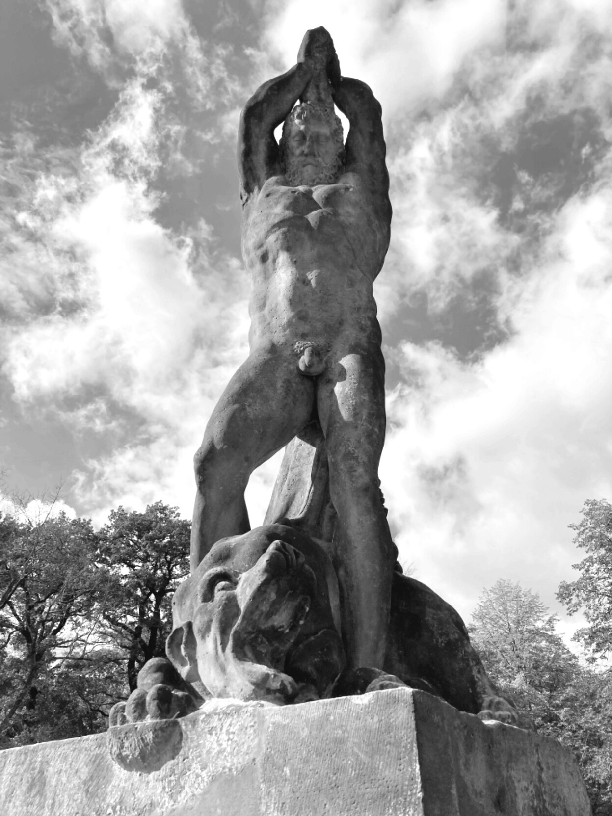 Sandsteinskulptur: Herkules im Kampf mit dem Höllenhund Cerberus