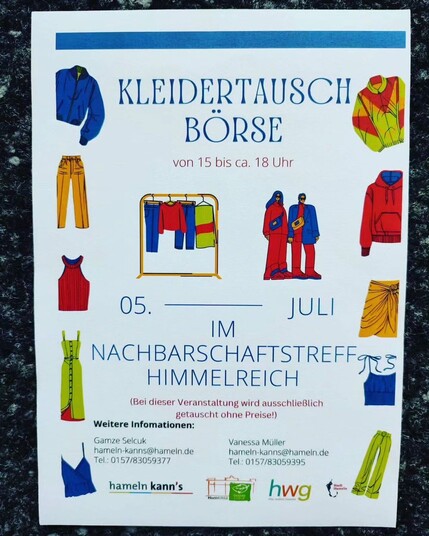 Info des #grüneslabor: Am kommenden Mittwoch, 5.7.23, habt ihr von 15 - 18 Uhr die Gelegenheit, bis zu 10 Kleidungsstücke im Nachbarschaftstreff Himmelreich vorbeizubringen und ggfs ein neues Lieblingsstück im Tausch mitzunehmen.