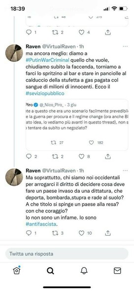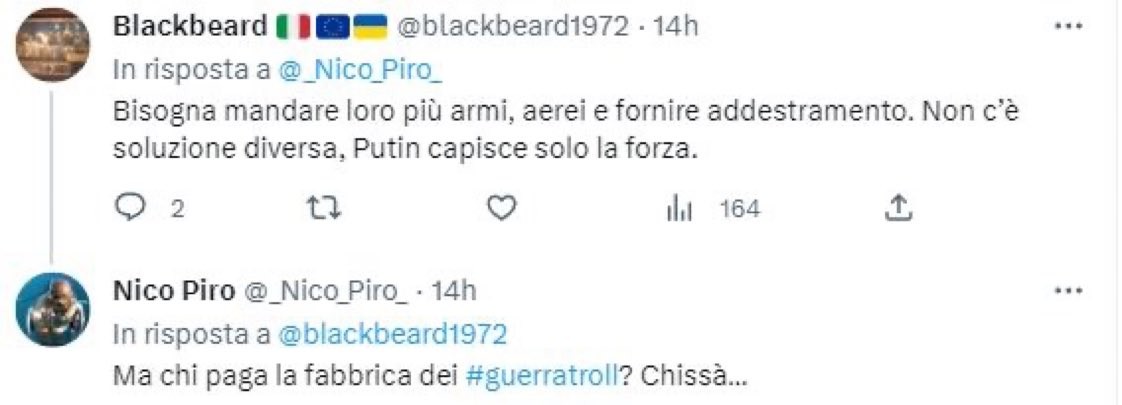 Ecco la risposta👇il solito opaco grumo di propaganda per il #sestopolo non si sta dedicando solo a parteggiare per una delle fazioni. Cerca di spostare l’attenzione attaccando in maniera volgare i pacifisti. Sempre gli stessi account, parole d’ordine comuni (la chat lavora)