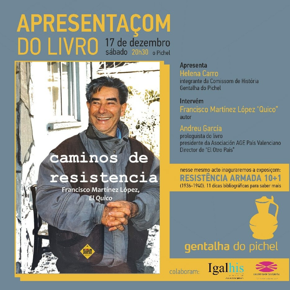 O próximo sábado, 17 de dezembro, às 20h30, Francisco Martínez López 'Quico', o derradeiro #guerrilheiro anti-franquista vivo, apresenta o seu novo #livro, 'Caminos de resistencia', no centro social O Pichel, em #SantiagoDeCompostela
