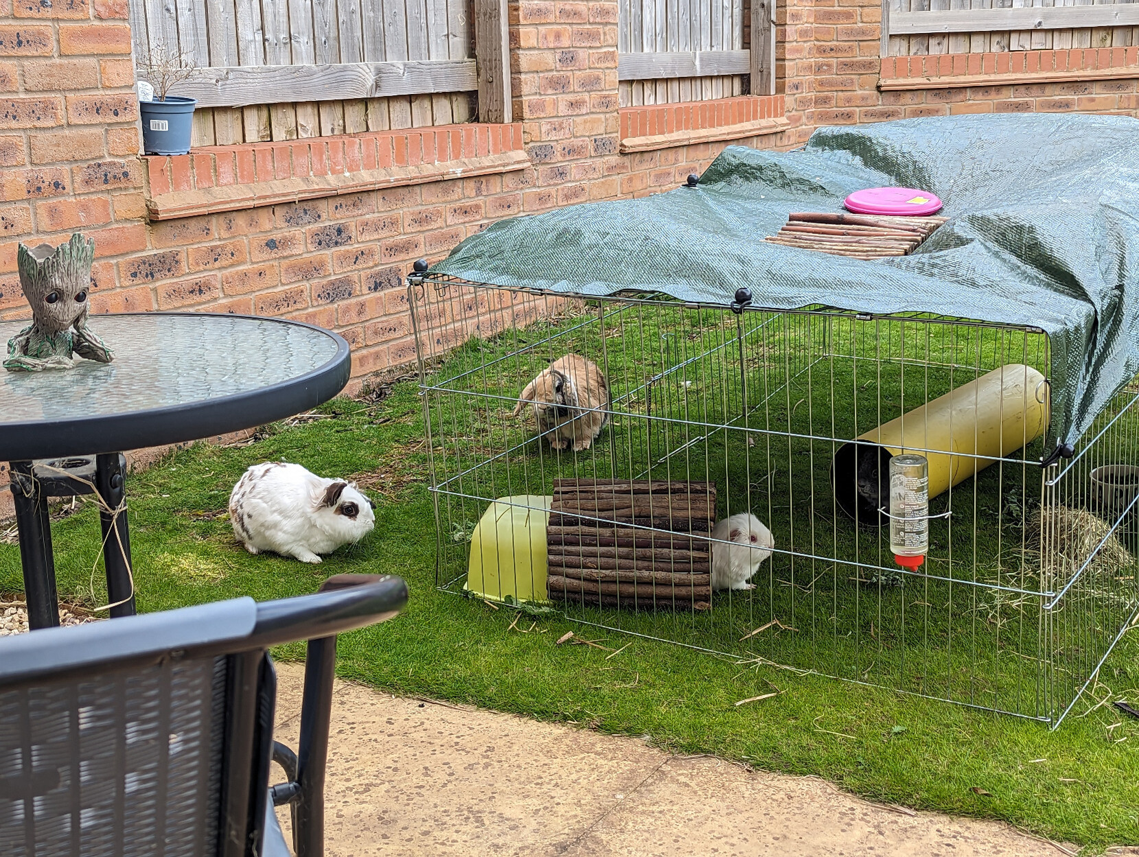 Because two rabits, a cat and a baby clearly aren't enough, we're looking after two guinea pigs for the week. The rabbits aren't sure what to make of them.