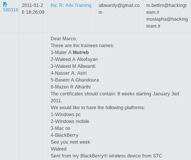Alleged Saudi kill team member Maher (Mater) Mutreb appears in a list of Saudi officials being trained in Italy to use #HackingTeam spy software in 2011. His sending contact "albwardy" made many hacking requests on behalf of Saudi https://t.co/09qQBdmIM9 https://t.co/wheJSFEbQx