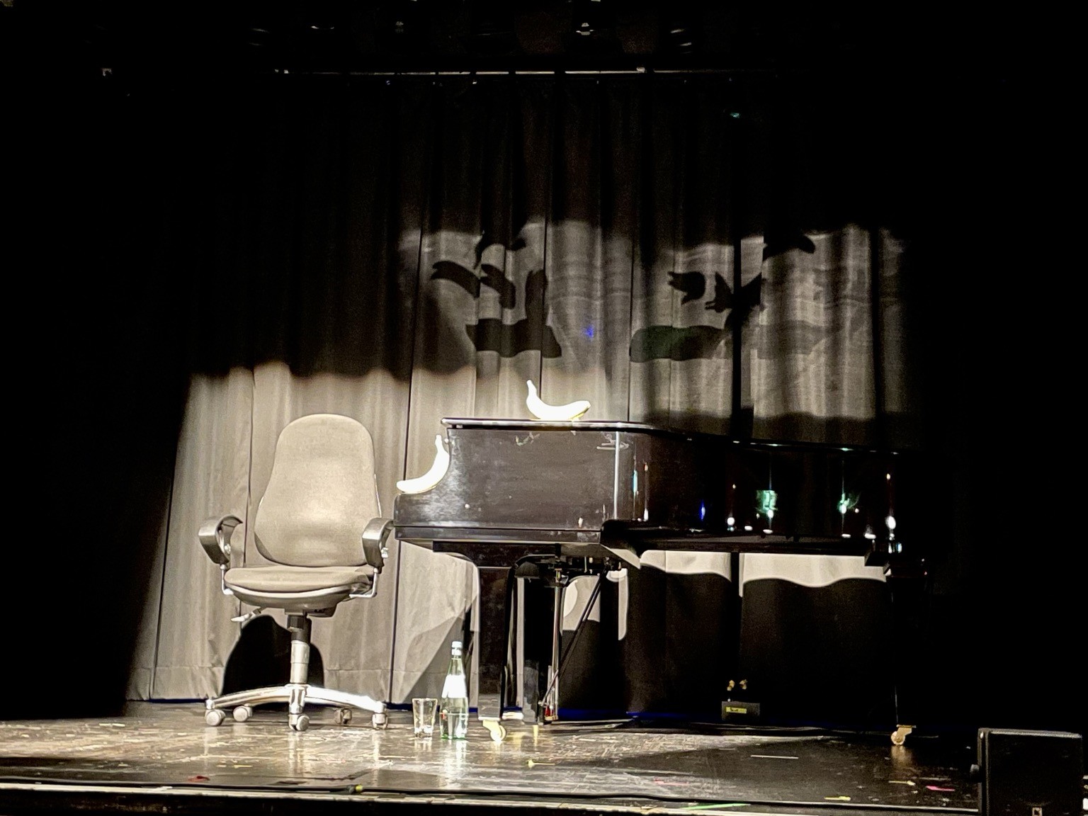 Stuhl, Flügel, Bananen, meine Frau und ich sind da.