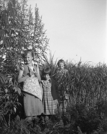 Dette koselige bilde av Solveig, Åshild og Bjørg i hamp- og hirseåkeren ble tatt på Bjølsen i 1936.