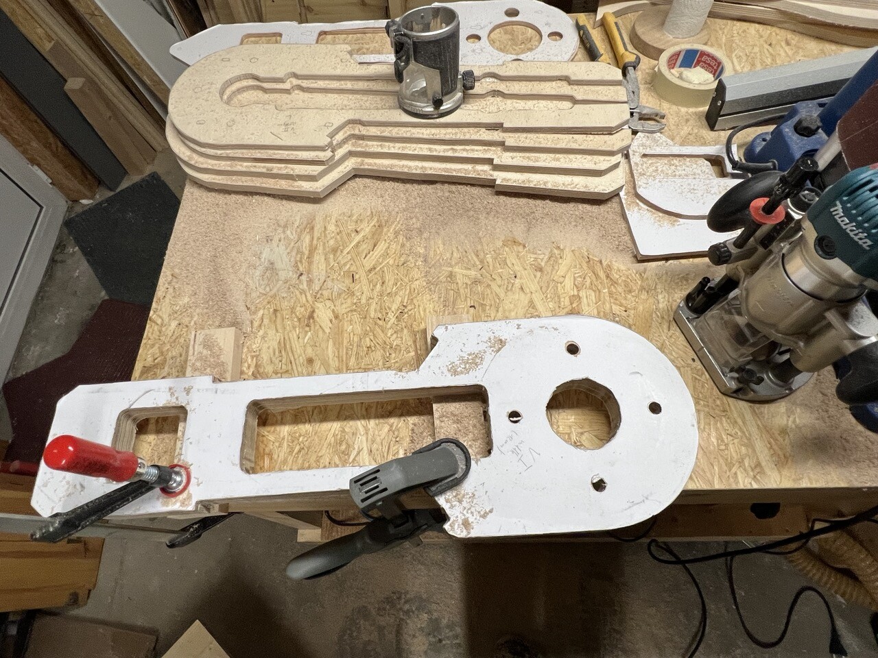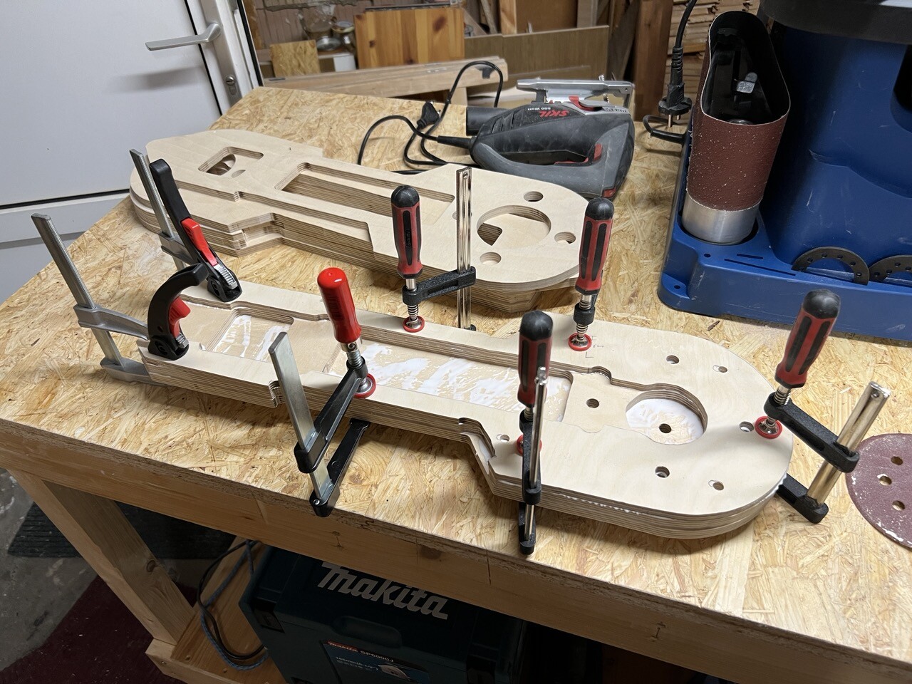 Ok I got all parts of the legs cut and routed. That‘s a plus. I started to glue up the first leg, that’s good too. But wtf happened there?! I made templates and trimmed it all flush just so that now the holes E not perfectly aligning. That triggers me. 🥺 Should have drilled the through holes after glueing. Well at least gained some XP. 😅 #woodworking #happinessMachine #maker