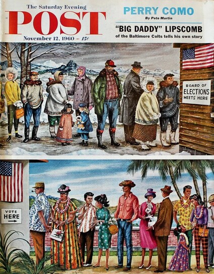 Nov 12, 1960 Saturday Evening Post cover, "First Vote in the New States" by Constantin Alajalov, celebrating Hawaii and Alaska residents new ability to vote in a national election thanks to statehood. #alaskahistory #hawaiihistory #alaska #Hawaii