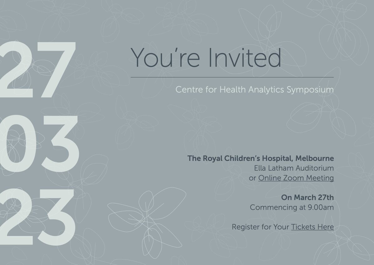 On behalf of the Melbourne Children’s Campus Centre for Health Analytics, we are delighted to announce that the Centre for Health Analytics Inaugural Symposium will be held on Monday, March 27 at 9:00am.