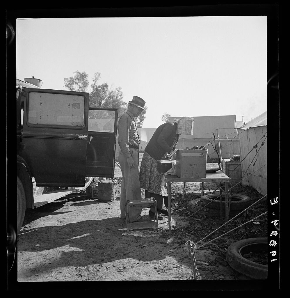 In a carrot puller' camp near #Holtville, #ImperialValley, #California. Migratory laborers from #Texas, packing up to leave camp because of work shortage. "Don't take any pictures of us. We don't want any truck with Mr. #Hearst."